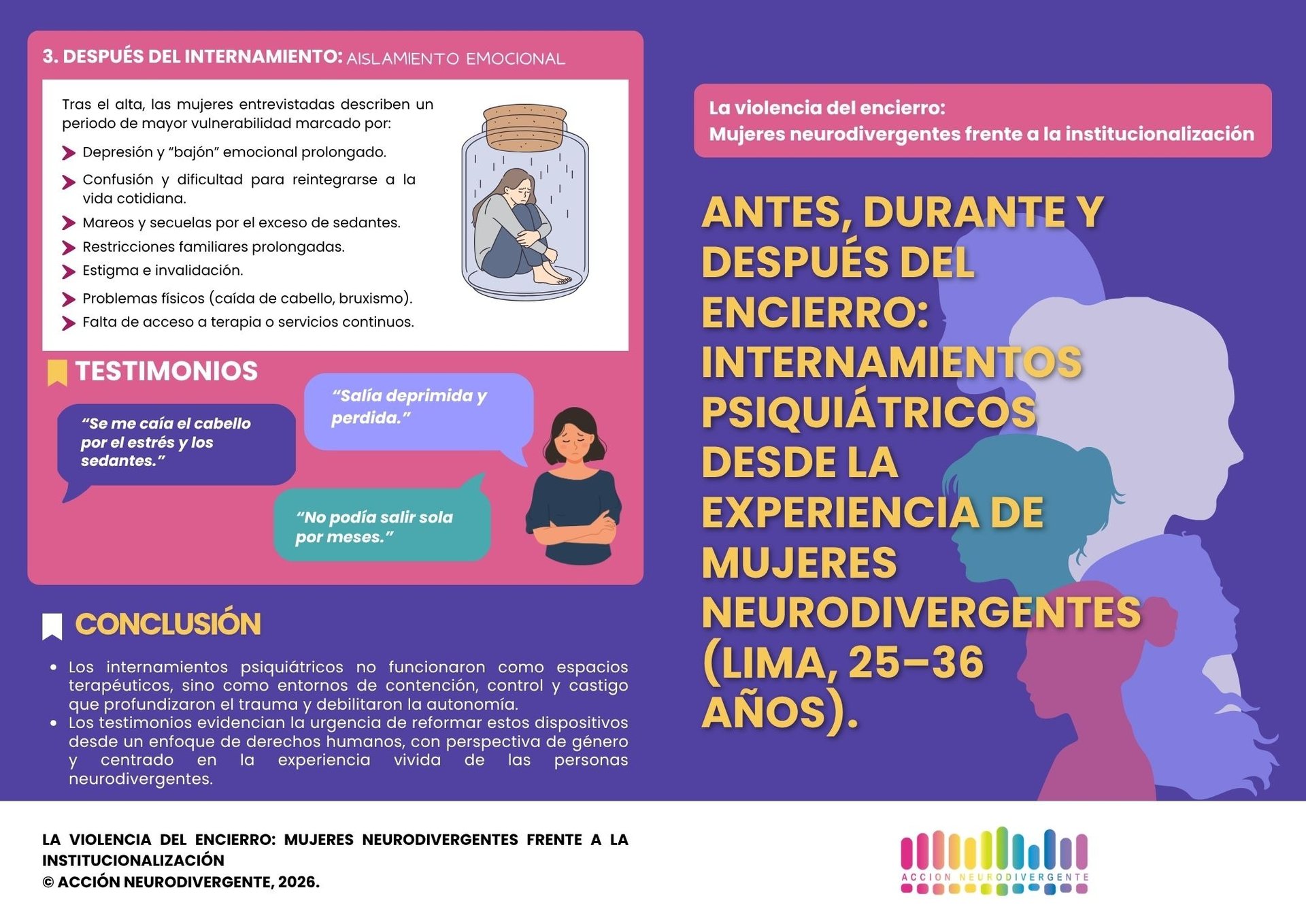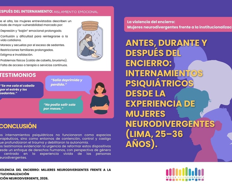 ¿Qué sucede cuando el sistema que debería cuidar, despoja de autonomía? Presentamos una síntesis visual de los relatos de mujeres neurodivergentes: desde la crisis inicial hasta las secuelas post-alta en el contexto limeño.
